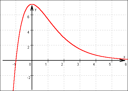 Folglich verhält sich f(x) im Unendlichen wie die klassische e-Funktion - nur ein wenig seitenverkehrt (wegen -x im Exponenten): Sie nähert sich der Null an. Im negativ Unendlichen sorgt der Faktor (x+1) für negativ unendlich große Werte: ![]() |